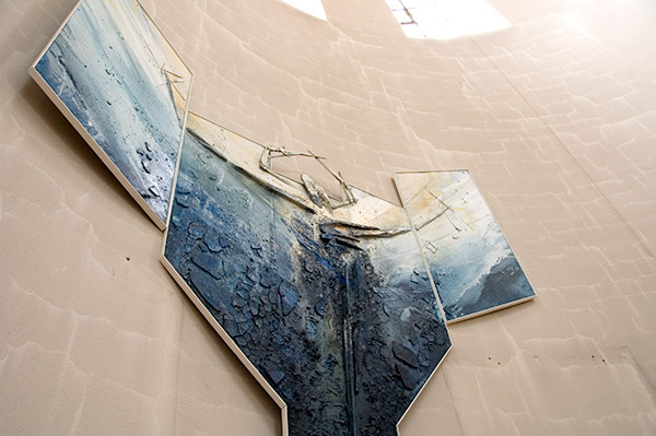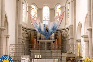 Fotos mit Impressionen der Arbeiten von Björn Hauschild in der Heilig-Geist-Kirche. Zu sehen sind raumgreifende, mehrteilige Arbeiten, die starke Farbakzente in den fast monochromen Raum setzen. Zur Webseite der Heilig-Geist-Kirche in Schweinfurt geht es hier.